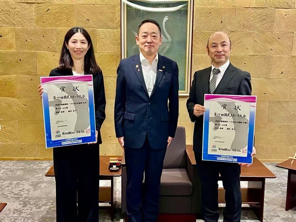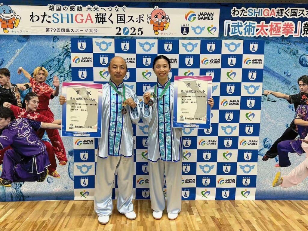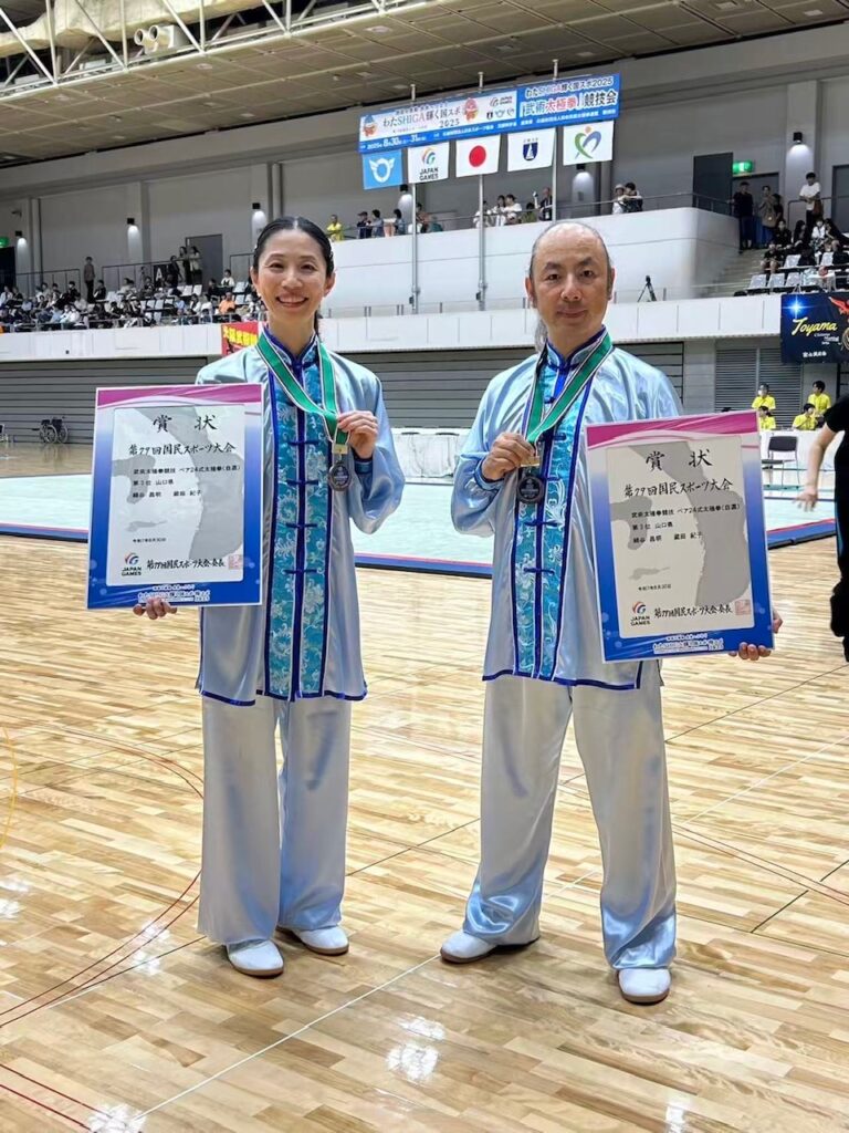 国スポ2025第3位入賞おめでとう! 皆様、こんにちは。 令和7年8月30~31日に第79回国民スポーツ大会「わたSHIGA輝く国スポ」武術太極拳競技(公開競技)が、滋賀県野洲市の野洲総合体育館で開催されました。 当会から、ペア24式太極拳(自選)(シニア男子・シニア女子)に、綿谷昌明選手・藏田紀子選手ペアが出場し、第3位入賞されました。大変おめでとうございます(^^)/ また、10月2日、大会入賞の報告のため、宇部市長 篠崎圭二さんへ表敬訪問されました。 « 全国大会で今年も3名入賞!おめでとうございます!